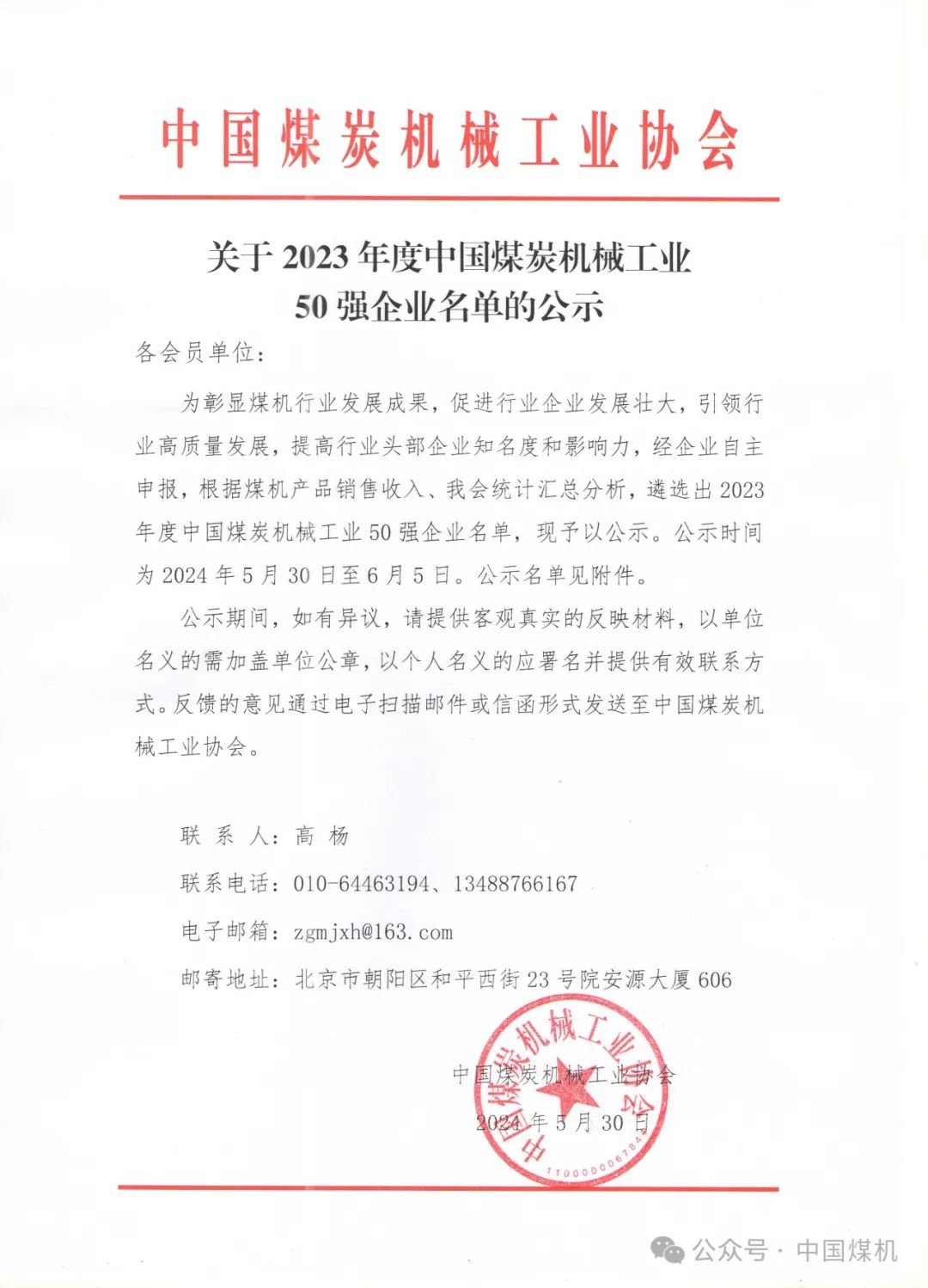 中煤機械科技公司連續(xù)5年名列中國煤炭機械工業(yè)50強