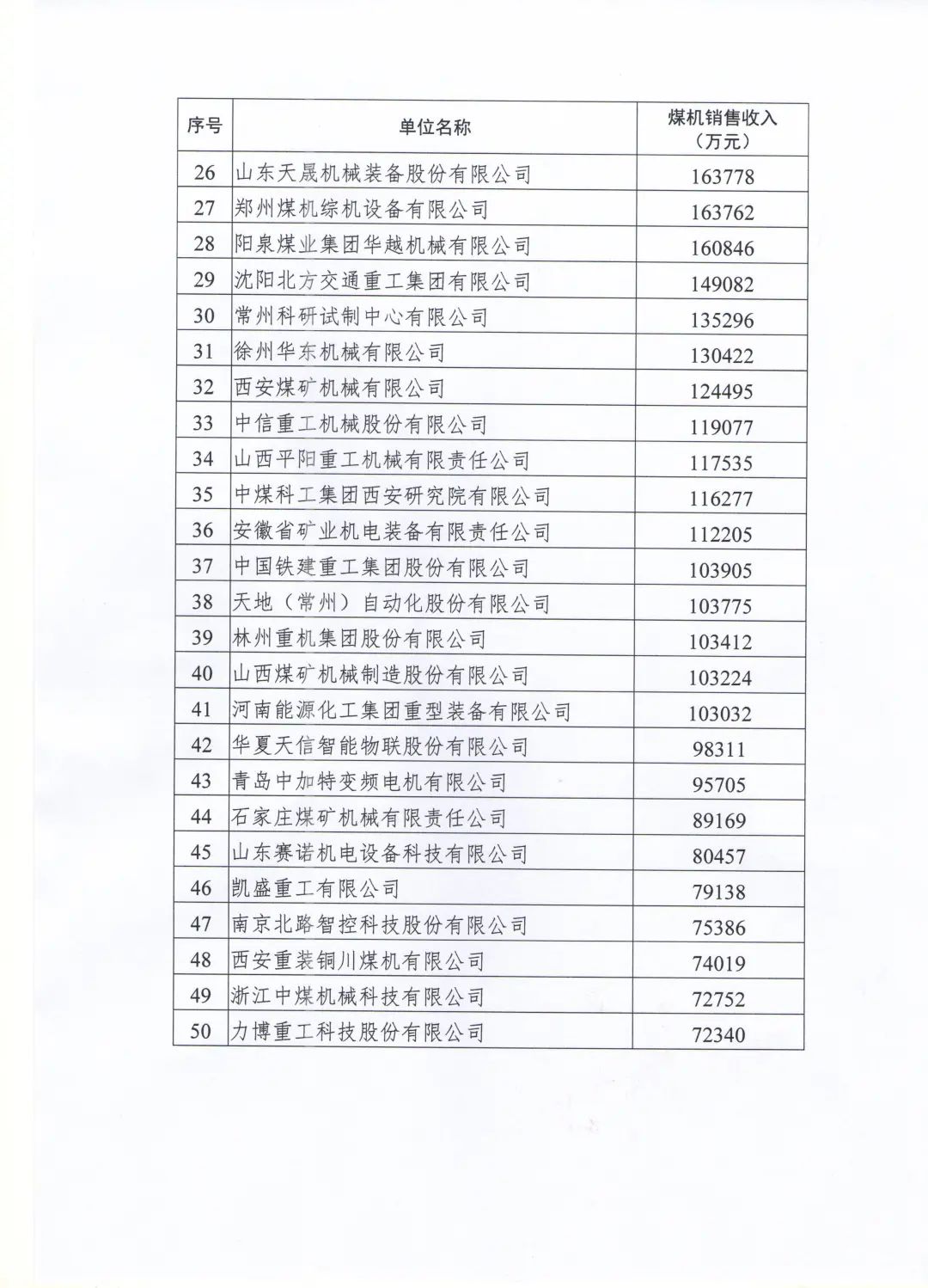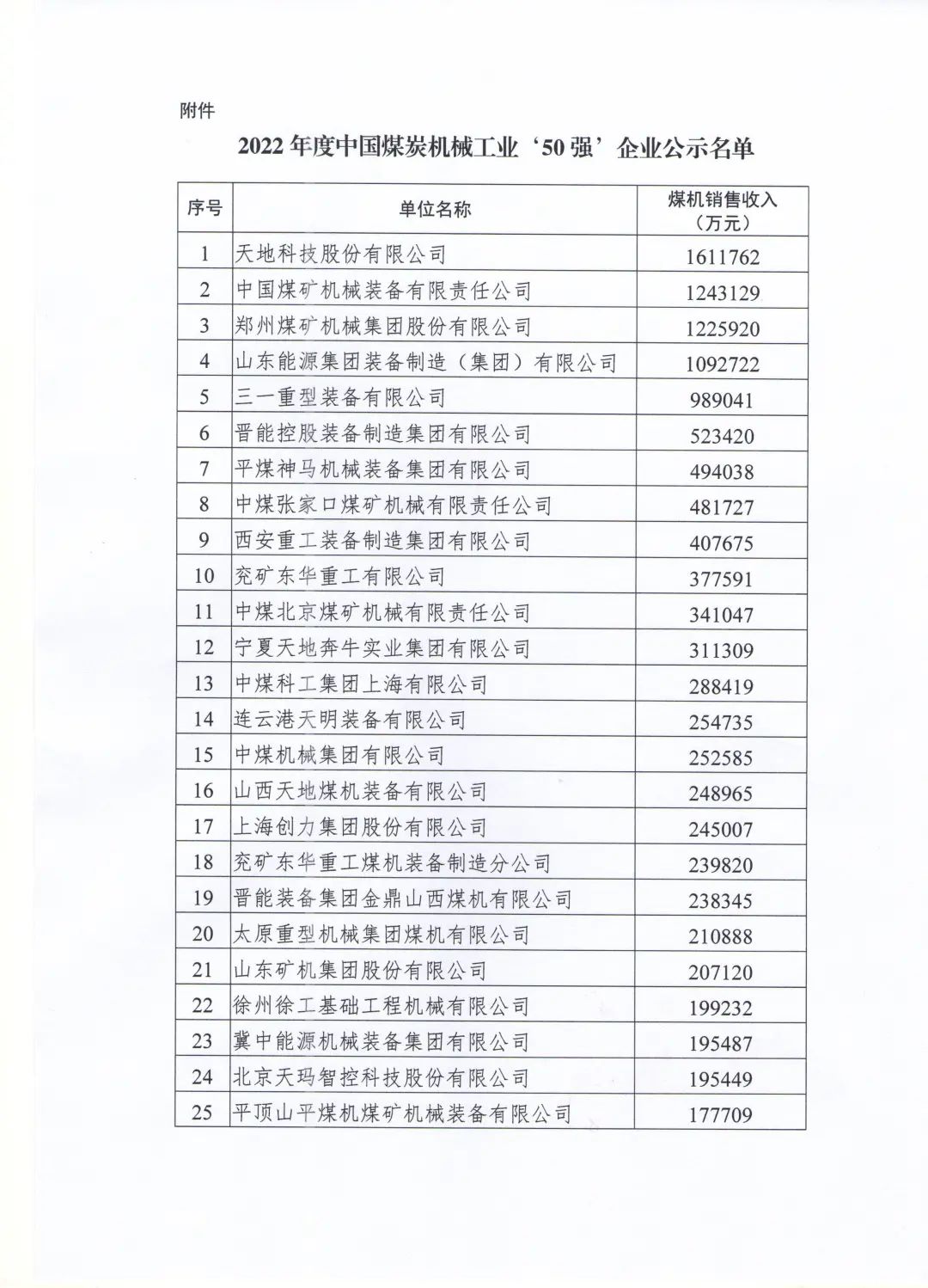 關(guān)于2022年度中國煤炭機械工業(yè)‘50強’企業(yè)名單的公示